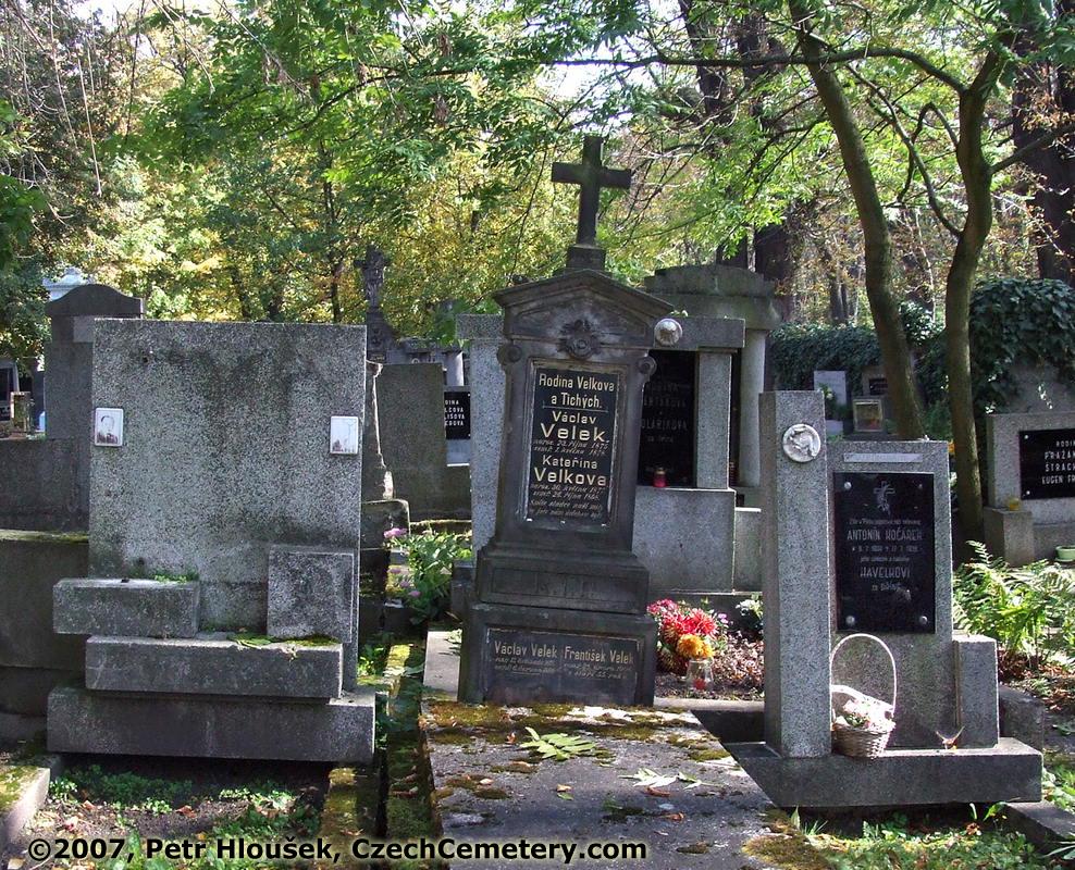 Links: Die name fehlt | Mitte: Václav Velek, *23.9.1875 - †1.5.1878 Kateřina Velková, *30.5.1877 - †26.10.1898 Václav Velek, *13.11.1878 - †6.6.1899 František Velek, jeho otec, †28.2.1906 (55) | Rechts: Antonín Kočárek, *9.7.1909 - †17.7.1938 | Umliegend: |