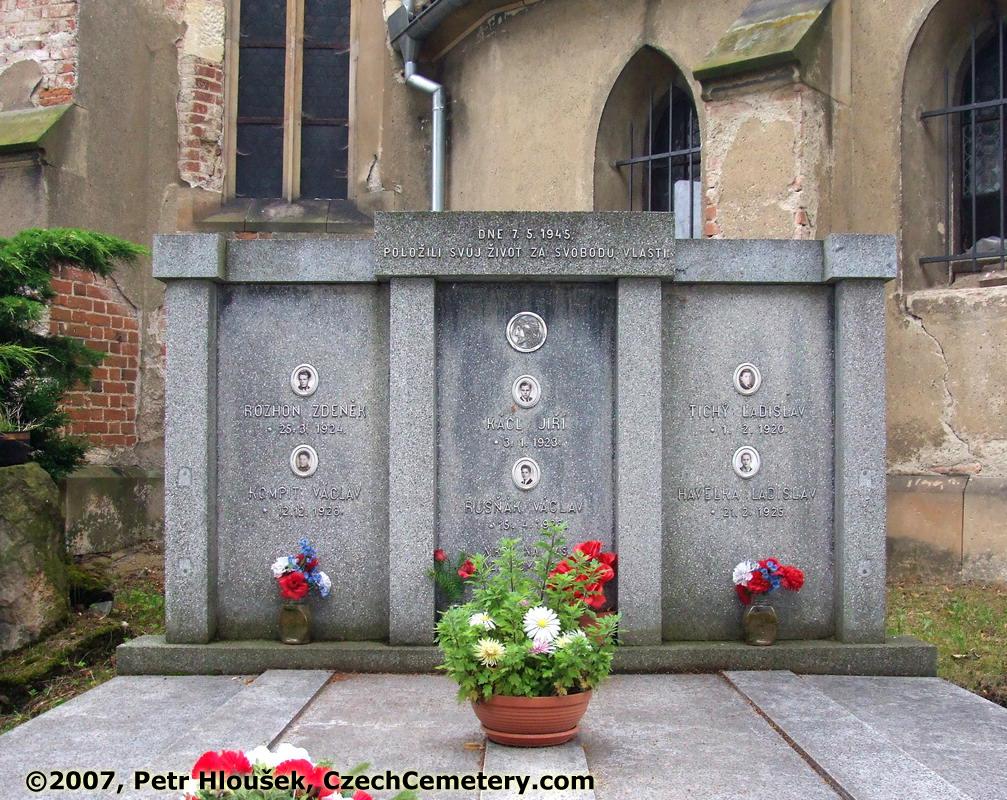 | Dne 7.5.1945 položili svůj život za svobodu vlasti Jiří kácl, *3.1.1923 - †7.5.1945 Václav Busňák, *15.4.1928 - †7.5.1945 Zdeněk Rozhon, *25.3.1924 - †7.5.1945 Václav Kompit, *12.12.1928 - †7.5.1945 Ladislav Tichý, *1.2.1920 - †7.5.1945 Ladislav Havelka, *21.2.1925 - †7.5.1945 |
