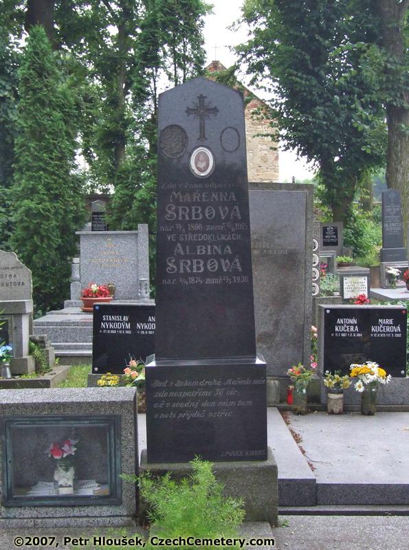 Vpředu: Mařenka Srbová, Středokluky, *15.8.1896 - †15.9.1915 Albína Srbová, *5.4.1874 - †22.5.1936 | Okolní náhrobky: Stanislav Nykodým, *21.10.1899 - †19.3.1960 Antonín Kučera, *11.7.1907 - †2.9.1984 |
